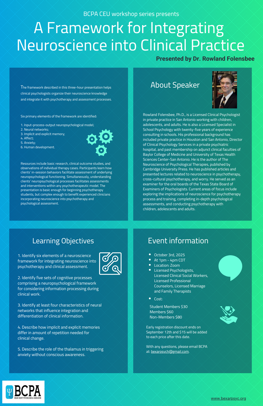 Core, overarching brain processes within each element are explained and the clinical relevance of each process for understanding clients’ behavioral and psychological manifestations is delineated. Findings from basic research, clinical outcome studies, and observations of individual therapy cases are incorporated into the presentation. Participants are helped to identify how their clients’ behaviors and verbalizations can facilitate assessment of underlying neuropsychological processes. At the same time, understanding their clients’ underlying neuropsychological processes in an integrated way can be used to support assessments and interventions undertaken within any psychotherapeutic model. Throughout the presentation, discussion breaks will be provided to guide participants in applying each element of the framework to their interventions with their clients. The initial presentation of the framework is kept simple enough that psychology students early in training can grasp and apply the concepts. However, based on the complexity of the overall framework, advanced clinicians can benefit from understanding they can glean from integrating neuroscience into already well-developed conceptions of treatment.